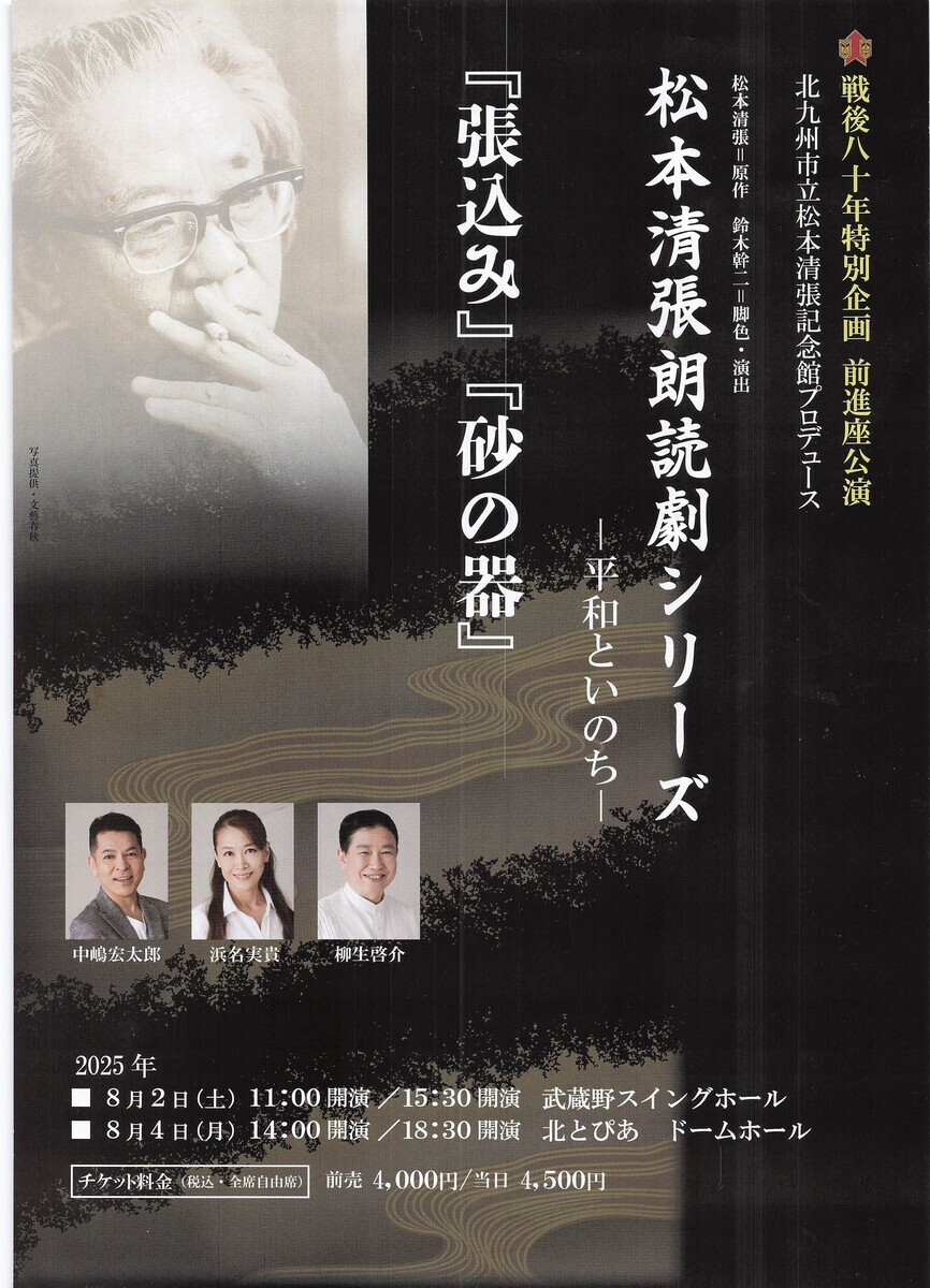 ところで松本清張は今ではどれほど読まれ、知られているのだろう。その作品はしばしばテレビドラマ化や映画化がされているので、それを通じて知っている若い世代もいるかもしれない。しかし司馬遼太郎ほどの認知度は今ではないように感じられる。私が中学生の頃、父の本棚には清張の文庫本がずらりと並び、片っ端から読んだものだ。『砂の器』に描かれた時代背景など、当時は全く想像もできていなかったが、それでも夢中になった。 当時読んだ清張の作品で一番印象が強いのは、彼が小説家として世に出るまでの苦難に満ちた生活を書いた自叙伝、『半生の記』である。1992年に亡くなった清張は、忘れられた作家では決してない。ただ、完全に「古典」として定着するには、まだ少し時間が熟成されていないのかもしれない。中途半端に歴史的であり、同時に現代的でもある。そんな過渡期にいる作家だからこそ、今、朗読劇というかたちで前進座が光を当てる意味がある。前進座の「松本清張朗読劇シリーズ」は、北九州市立松本清張記念館のプロデュースで2003年に始まり、毎年上演が続いているという。これほど質の高い朗読劇を通して、松本清張文学の遺産を次世代に継承していっくことの意義は大きい。一観客としてこの企画を追い続けたいし、一人でも多くの人にこの素晴らしい舞台が届くことを願っている。そしていつかは、小倉の松本清張記念館でこの公演に立ち会いたい。